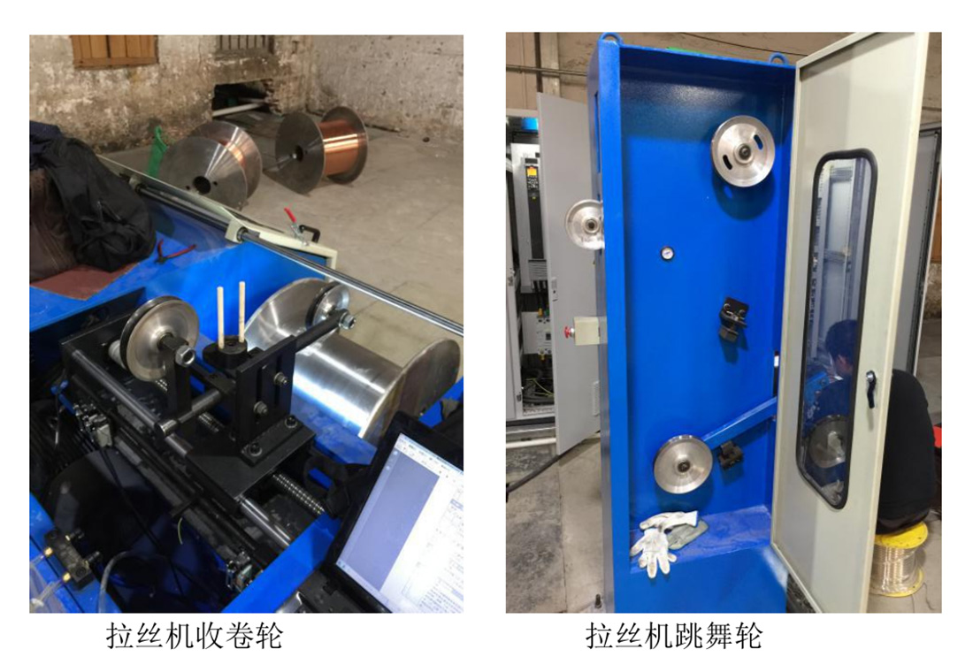 上面兩張圖片是我司技術(shù)工程師在廣東佛山某電纜廠拍的,因為當時我們主要是在現(xiàn)場調(diào)試后面的收卷部分,也是難點的一部分,所以就拍了收卷輪和跳舞輪的圖片。當時現(xiàn)場的收卷電機是三相異步電動機,功率為15KW,采用18.5KW的FC360頻器進行控制。變頻器外接設(shè)備上檢測跳舞輪位置的滑動電阻,作為反饋跳舞輪位置的反饋信號;外接通過PLC 前饋計算后的模擬量輸出作為前饋信號。