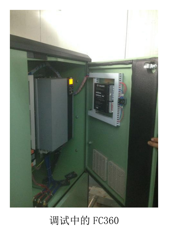 以上兩張圖片是我司在佛山某空壓機(jī)應(yīng)用現(xiàn)場(chǎng)所拍,我司的技術(shù)工程師正在調(diào)試FC360變頻器??諌簷C(jī)變頻調(diào)速控制原理是電動(dòng)機(jī)拖動(dòng)空氣壓縮機(jī)旋轉(zhuǎn),使之產(chǎn)生壓縮空氣,并存儲(chǔ)于儲(chǔ)氣罐中。儲(chǔ)氣罐中空氣壓力的大小取決于空氣壓縮機(jī)產(chǎn)生壓縮空氣的能力(本系統(tǒng)中即取決于電動(dòng)機(jī)的轉(zhuǎn)速)和用戶(hù)用氣量之間的平衡狀況,為了保證供氣質(zhì)量,要求儲(chǔ)氣罐空氣壓力穩(wěn)定在某一數(shù)值上。儲(chǔ)氣罐內(nèi)的壓力為被控量,壓力變送器將儲(chǔ)氣罐的壓力變換成電信號(hào)送給變頻器PID單元,與壓力給定值進(jìn)行比較,PID能單元根據(jù)比較所得偏差的大小和方向按預(yù)定的 PID 運(yùn)算規(guī)律運(yùn)算后產(chǎn)生控制信號(hào)改變變頻器的輸出,從而改變電動(dòng)機(jī)的轉(zhuǎn)速,使儲(chǔ)氣罐內(nèi)的實(shí)際壓力始終維持在給定值上。