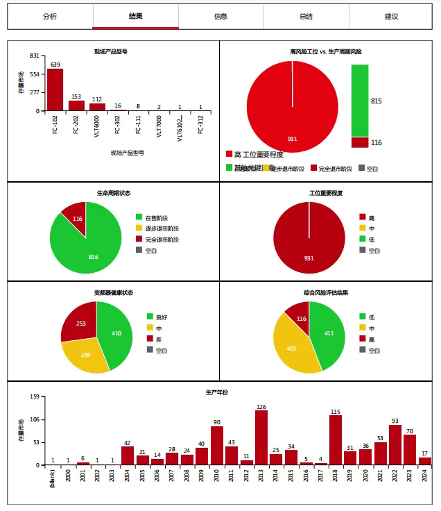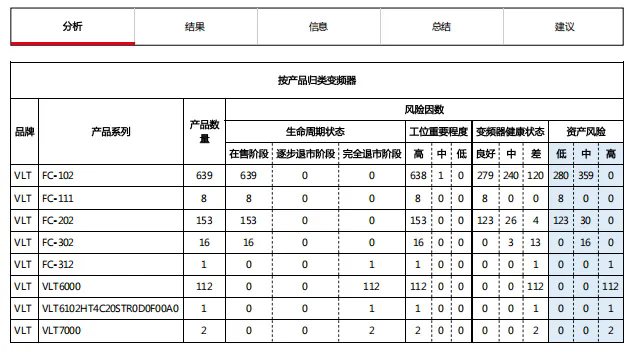 丹佛斯工程師帶領團隊,現(xiàn)場推進評估工作。依據現(xiàn)場評估所獲取的數(shù)據信息可知,當前該熱力公司在用的變頻器以丹佛斯FC102和FC202機型為主,有少量FC302和FC111機型,其中112臺已退市的VLT6000機型仍在使用,445臺變頻器已使用超過10年,253臺變頻器健康狀態(tài)較差。此次現(xiàn)場評估工作從變頻器健康狀態(tài)、生命周期、工位重要程度三個維度進行了分析,幫助客戶梳理變頻器臺賬,排查故障,為后續(xù)的設備維保改造與預算制定計劃提供了依據。