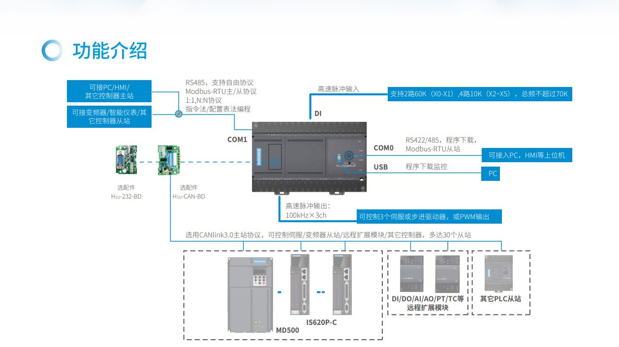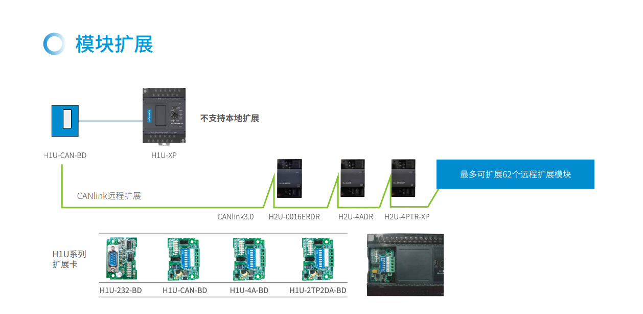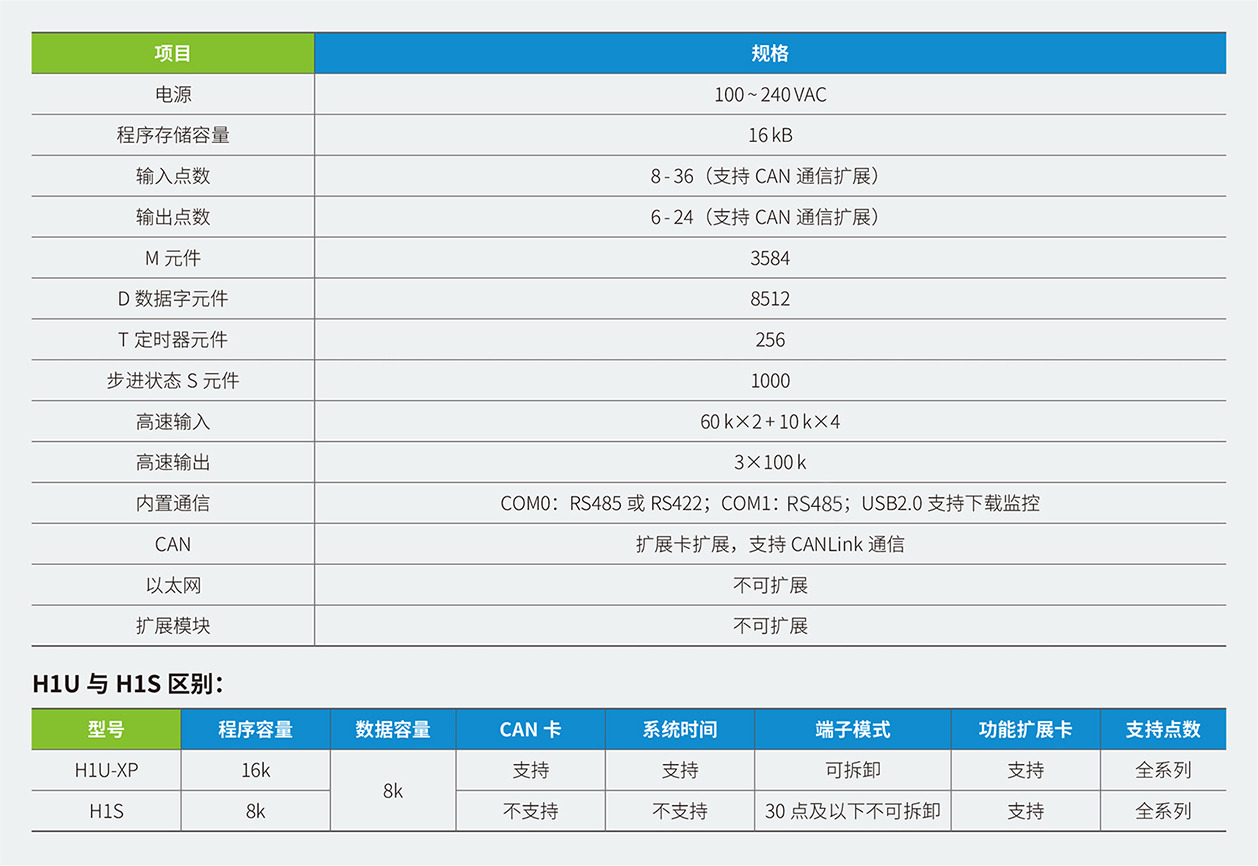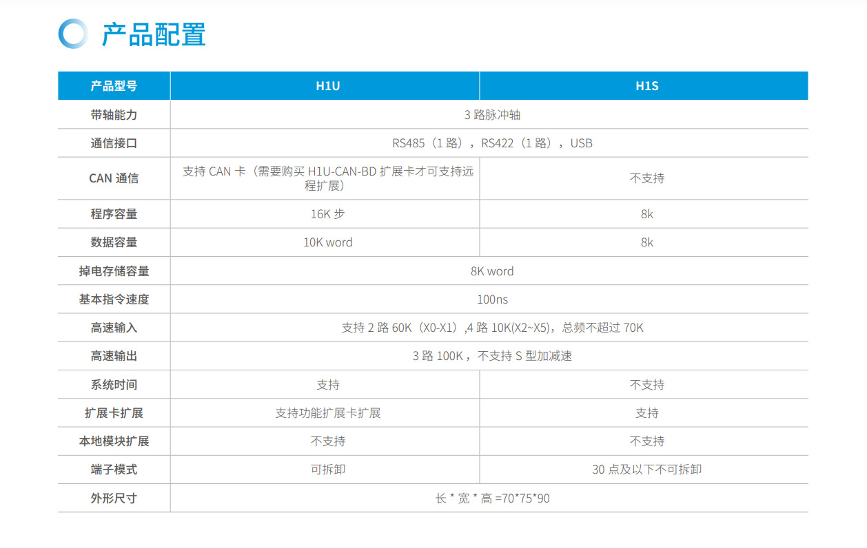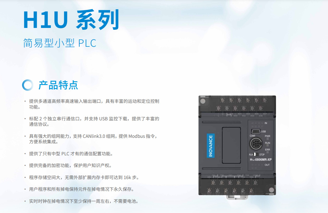 H1U系列PLC 隸屬匯川小型PLC 經(jīng)濟(jì)型系列,其主要特點具備小體積,大程序容量,并具備3 軸高速100K 脈沖以便實現(xiàn)高精度定位。支持CANlink 擴展卡擴展H2u 系列的遠(yuǎn)程擴展模塊來豐富IO。該系列PLC 點數(shù)覆蓋14~60 點。是小型自動化設(shè)備高性價比的選擇。