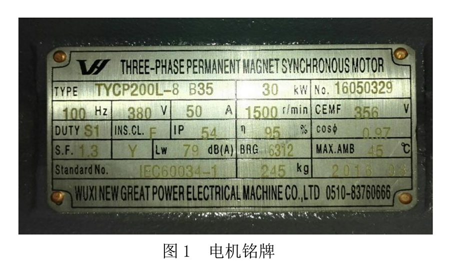 我們選用的是30KW的FC360變頻器,驅(qū)動(dòng)的是30KW的三相交流永磁同步電機(jī),電機(jī)磁極數(shù)為8極,額定頻率為100Hz,具體電機(jī)參數(shù)如圖1銘牌所示。FC360采用VVC+控制原理,配置過程閉環(huán)模式后,試運(yùn)行十分流暢,但停車后會(huì)有一點(diǎn)點(diǎn)慣性反轉(zhuǎn)現(xiàn)象。后來發(fā)現(xiàn)是由于空壓機(jī)本身的機(jī)械慣性導(dǎo)致的,為了克服慣性問題,我們?cè)谧冾l器上加了一點(diǎn)點(diǎn)直流制動(dòng),效果馬上就體現(xiàn)出來了,能做到說走就走,說停就停的效果。值得注意的是,變頻器對(duì)同步電機(jī)的電機(jī)參數(shù)比較敏感,所以事先跟電機(jī)廠家確定好電機(jī)的定子阻抗和d軸電感這兩個(gè)參數(shù),效果會(huì)更佳。
