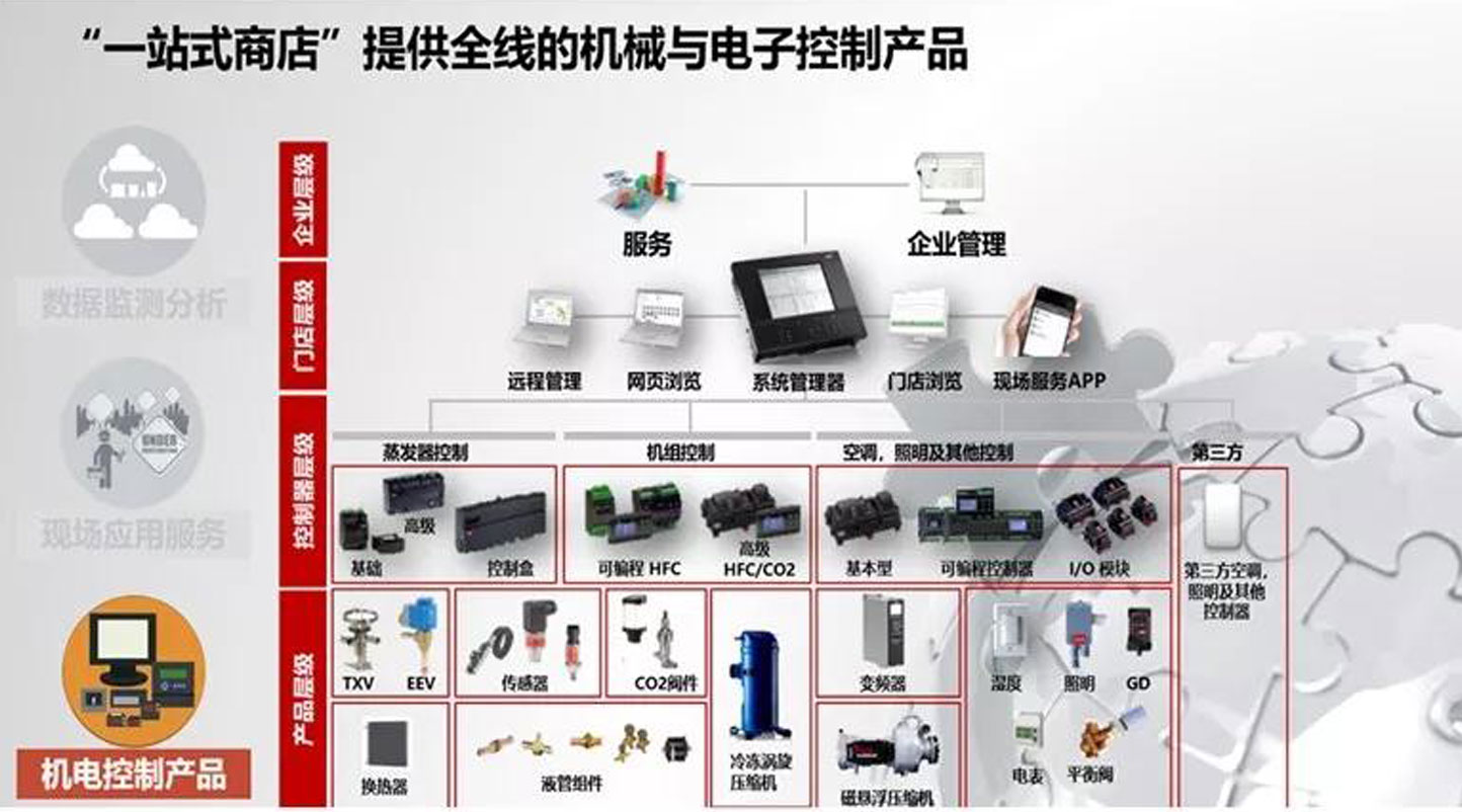 包括Turbocor@磁懸浮無油壓縮機、Danview@樓宇自控系統(tǒng)、MCX可編程控制器、溫濕度傳感器、壓力傳感器、流量傳感器、CO2探測器、溫控器、能量表、動態(tài)平衡調(diào)節(jié)閥、靜態(tài)平衡調(diào)節(jié)閥、電動調(diào)節(jié)閥、電動蝶閥、手動蝶閥、球閥、板式換熱器、變頻器、冷凍冷藏渦旋壓縮機、電子膨脹閥、熱力膨脹閥、蒸發(fā)器控制器、壓縮機組控制器、ADAPKOOL®系統(tǒng)控制器、微通道換熱器以及CO2制冷系統(tǒng)解決方案可涵蓋制冷、空調(diào)、照明等方面的各種需求,實現(xiàn)暖通空調(diào)和制冷設(shè)備的自動監(jiān)控、優(yōu)化管理以及能源管理。