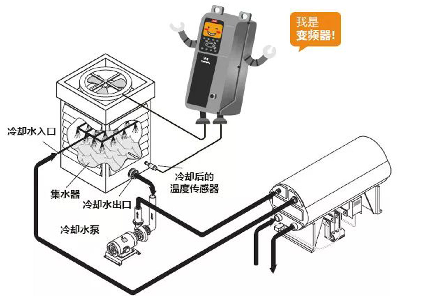 加入變頻器后,操作十分簡單,設(shè)定制冷機(jī)組所需要的冷卻水溫度、溫度傳感器必要參數(shù),變頻器便可對冷卻塔的散熱風(fēng)機(jī)轉(zhuǎn)速進(jìn)行實(shí)時(shí)的動態(tài)控制啦~
