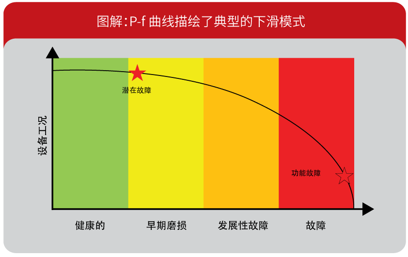 基于工況的維護是利用獲取的數(shù)據(jù)監(jiān)測現(xiàn)有設備的健康狀況。為此,要選擇關鍵參數(shù)作為識別發(fā)展性故障的指標。設備狀況通常會隨著時間的推移而下滑。P-f 曲線表明了典型的下滑模式。設備不能執(zhí)行預期的功能時,就會發(fā)生功能故障。基于工況的維護就是要在故障真正發(fā)生之前檢測潛在的故障。規(guī)劃維護措施的優(yōu)勢如下: