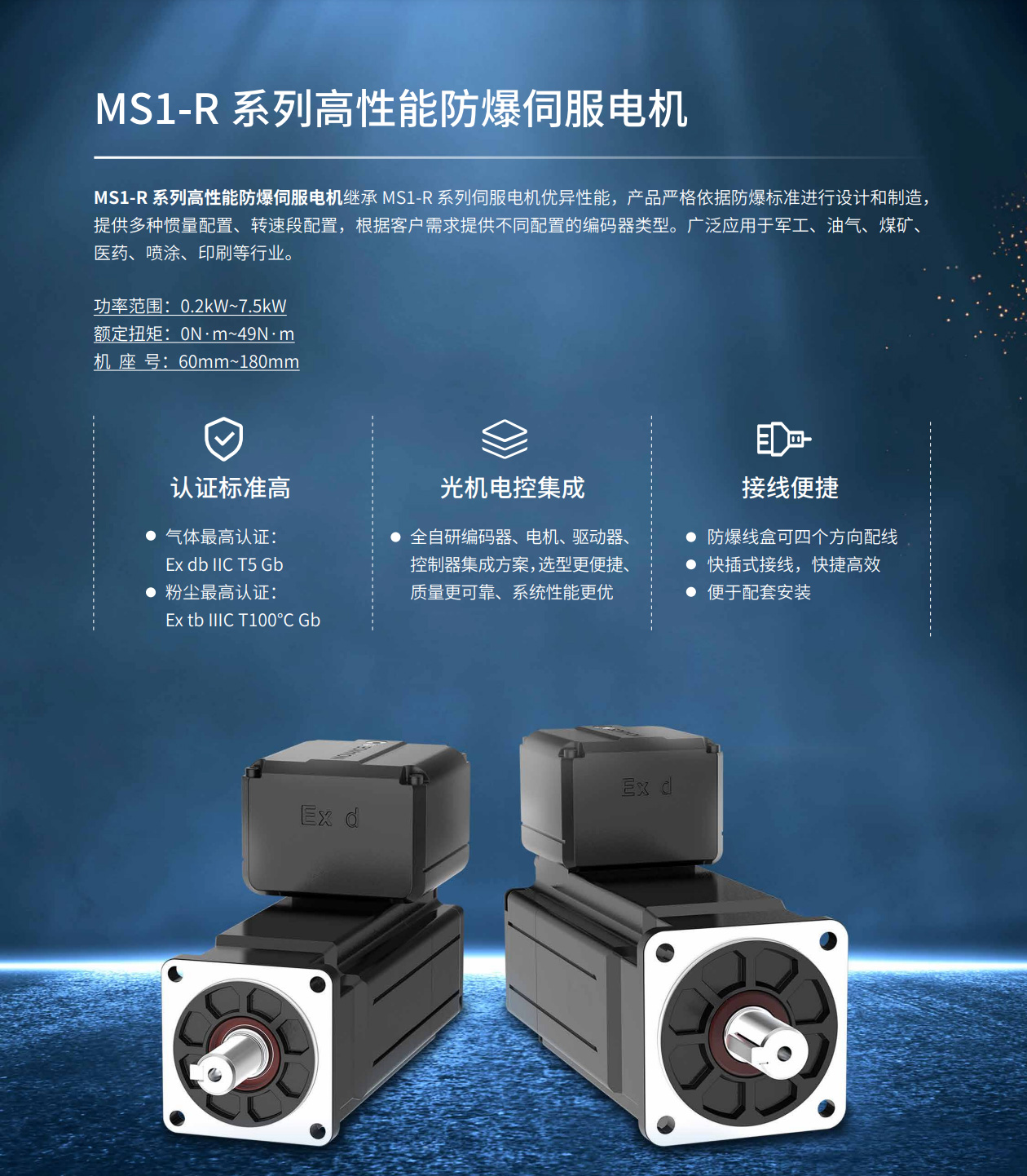 MS1-R系列防爆電機(jī)是匯川技術(shù)研制的最新一代防爆電機(jī)產(chǎn)品,功率范圍0.2kW~1.8kW,機(jī)座號 60mm~130mm,提供多種慣量配置、轉(zhuǎn)速段配置,可根據(jù)客戶需求提供不同配置的編碼器類型。適用于特種裝備,包裝,醫(yī)藥等行業(yè),實現(xiàn)快速精確的位置控制、速度控制、轉(zhuǎn)矩控制和軌跡控制。