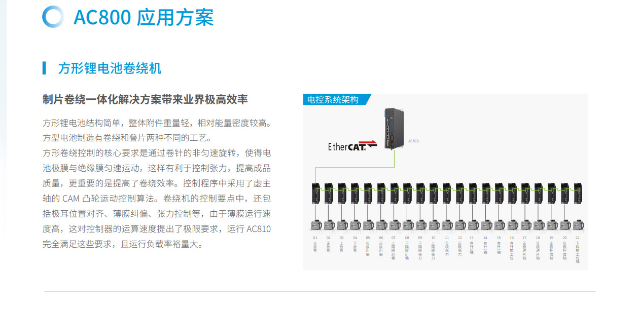 AC800 高性能智能機械控制器,是基于Intel X86 處理器硬件平臺,符合PLCopen 規(guī)范的高性能多軸運動控制器,以EtherCAT 為總線,可以實現(xiàn)多軸伺服控制,尤其適用于先進制造業(yè)的高速生產(chǎn)裝備和大型設備的控制。