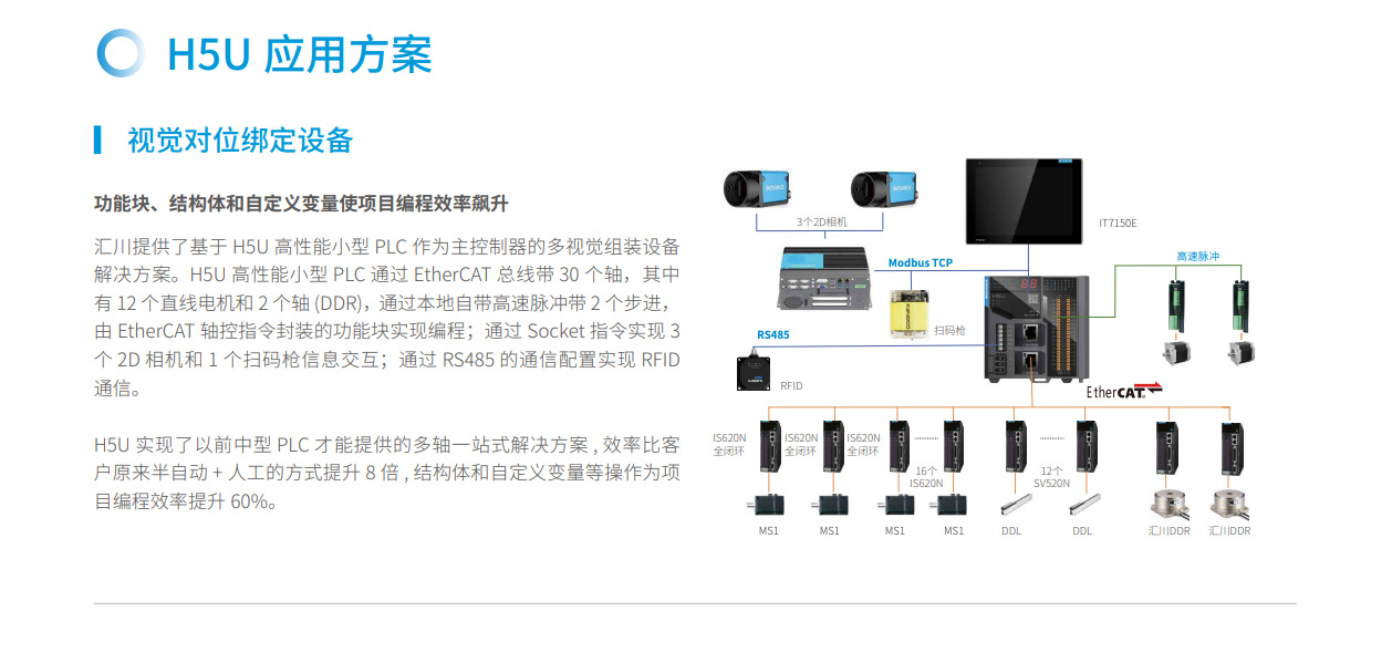 匯川技術(shù)推出首個(gè)應(yīng)用EtherCAT 總線的小型PLC H5U,讓線體設(shè)備飛速運(yùn)轉(zhuǎn)。隨著終端消費(fèi)日趨升級(jí),生產(chǎn)制造面臨巨大的壓力,而H5U 能夠簡(jiǎn)化布線量、加快編程調(diào)試時(shí)間、滿足帶軸能力的要求以及嚴(yán)苛的成本控制需求,從容應(yīng)對(duì)嚴(yán)峻的挑戰(zhàn),是將EtherCAT總線應(yīng)用到小型PLC 的先鋒之作。